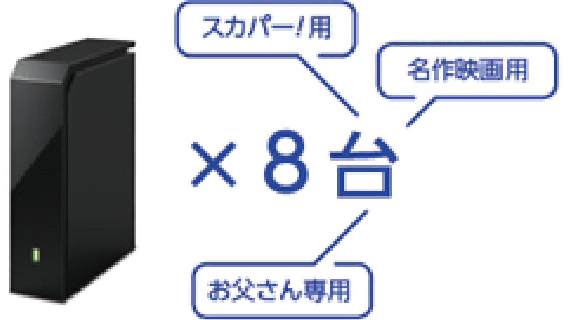 最大8台まで登録可能なので、家族それぞれ自分専用のUSBハードディスクを持ったり、番組のジャンル別に使い分けることが可能です。