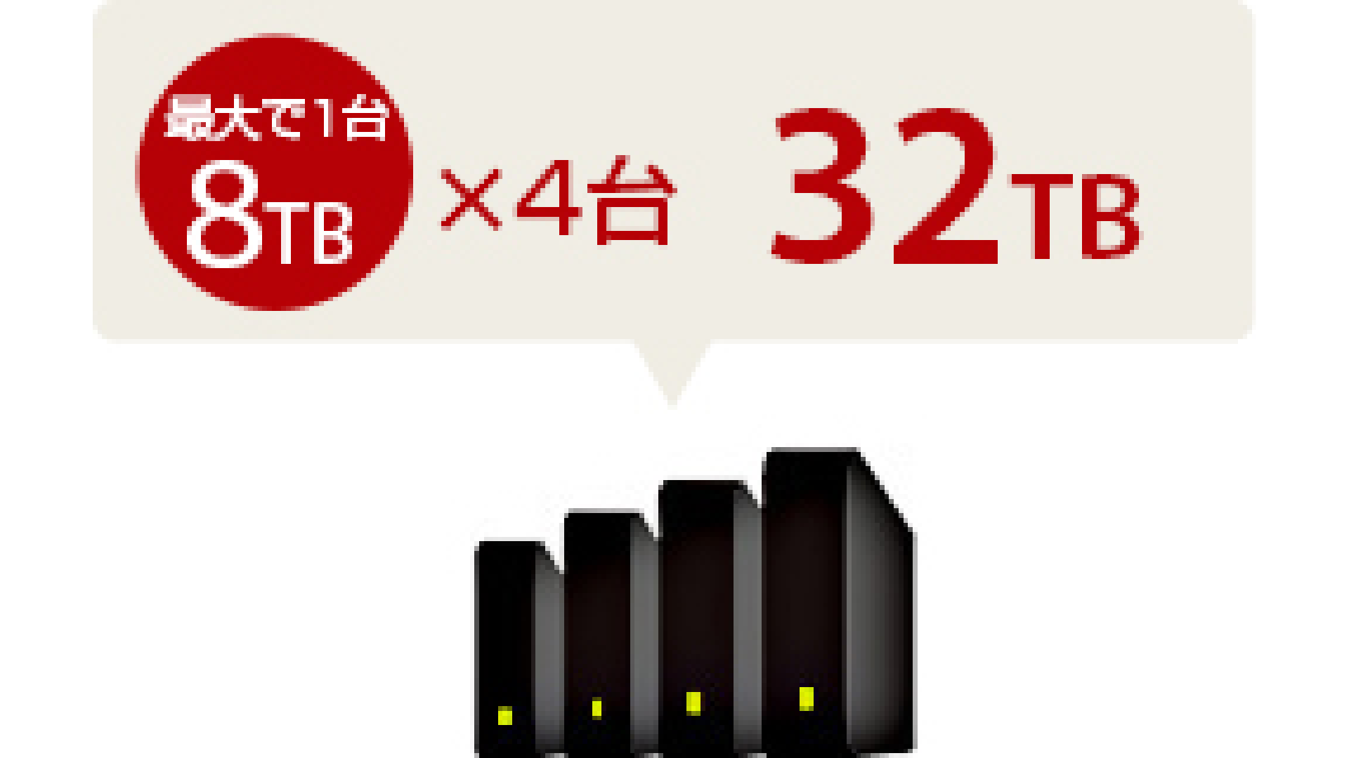 最大で1台8TBのUSBハードディスクまで使用可能。4台同時接続すると、最大32TBのハードディスク容量を使うことが可能です。