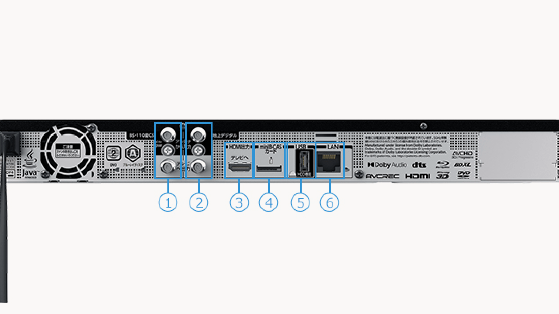 内蔵ハードディスク/ 外付けUSBハードディスク/ ブルーレイディスク/DVD AAC(5.1ch)、 Dolby digital(2ch)