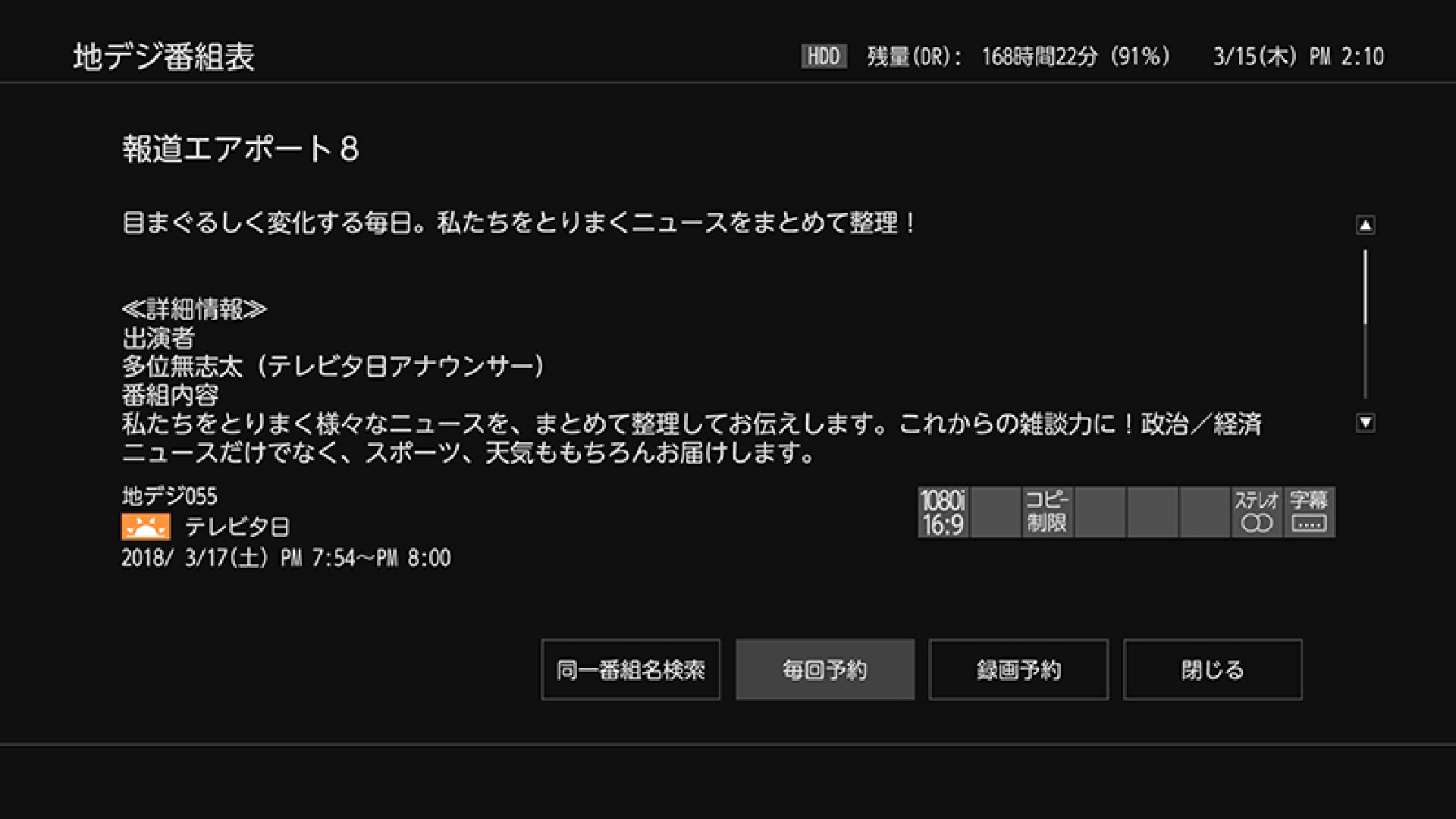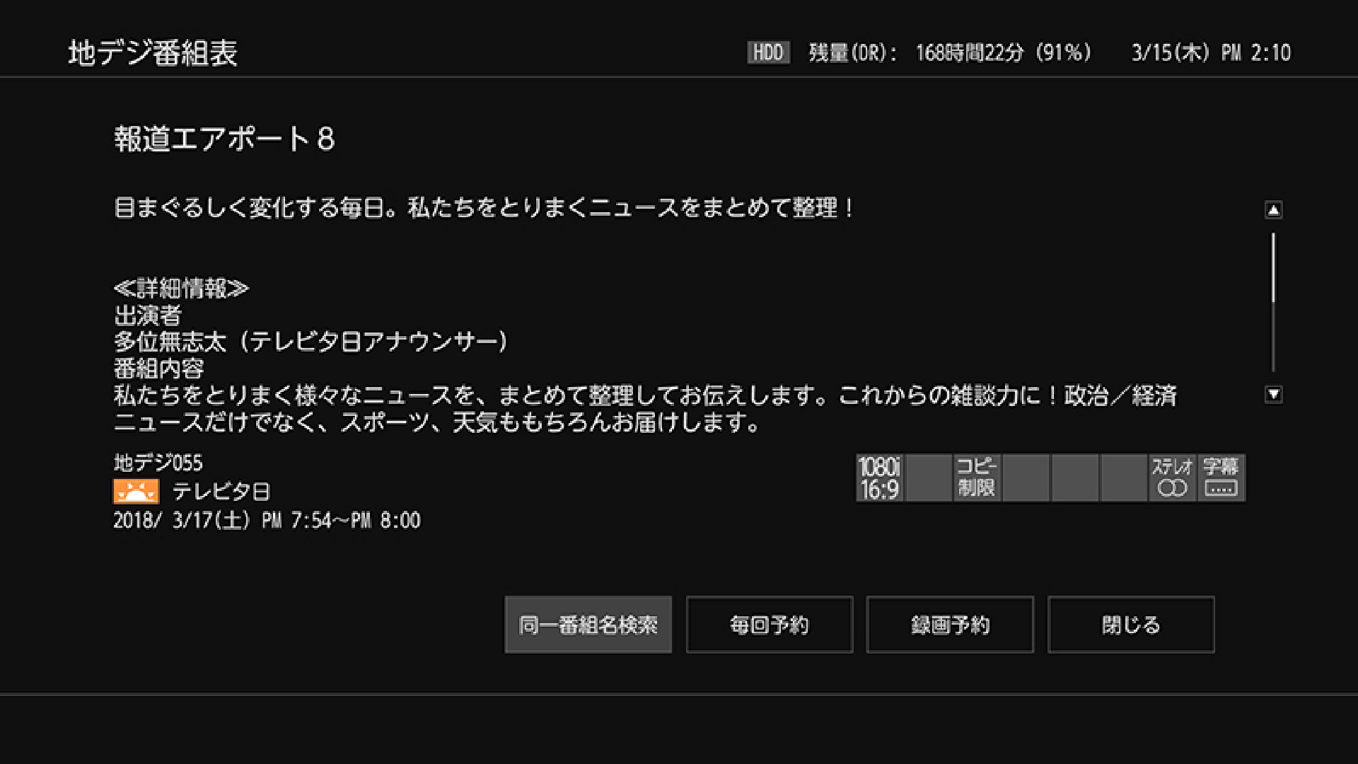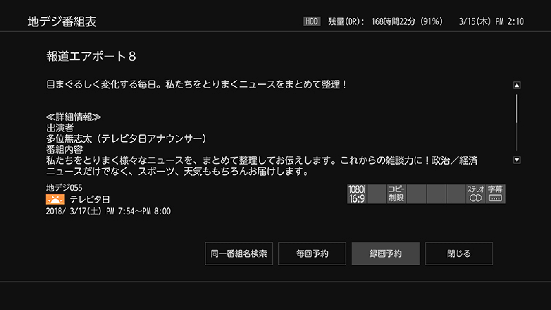 なお、1回の最長連続録画可能時間は、ハードディスク、USBハードディスクへの録画の場合は15時間までです。ブルーレイディスクへの録画の場合は8時間未満です。