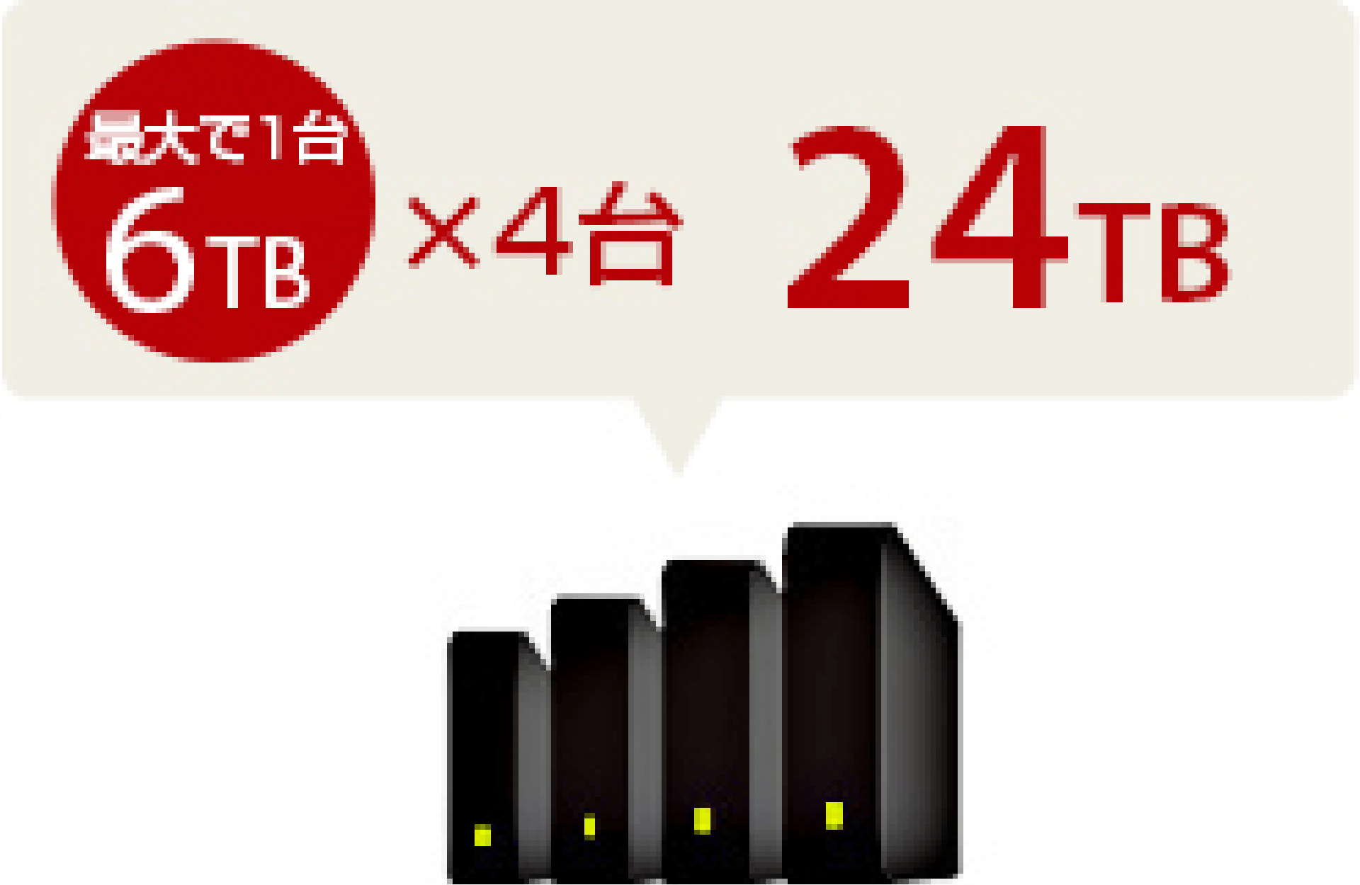 最大で1台6TBのUSBハードディスクまで使用可能。4台同時接続すると、最大24TBのハードディスク容量を使うことが可能です。