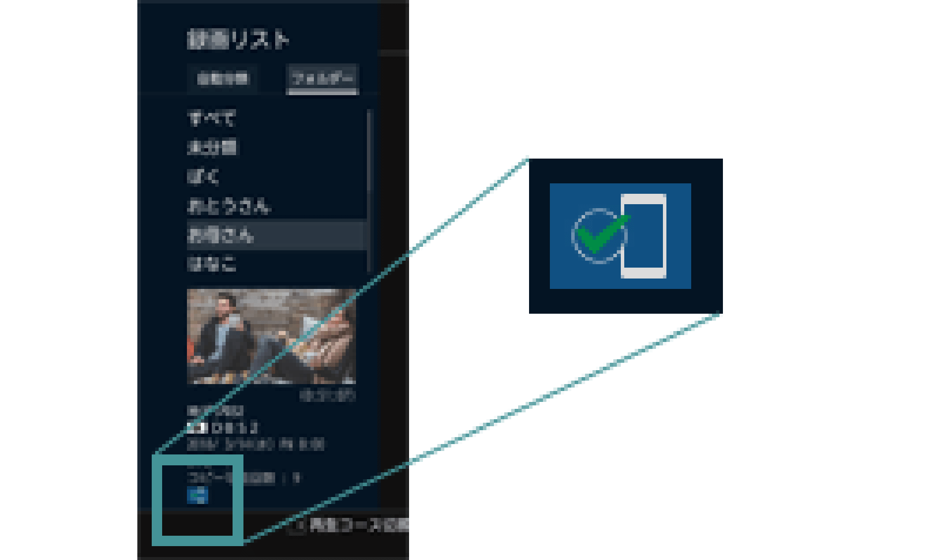 録画予約をする時に「持ち出し設定」で「スマホ持ち出し」を選択すると、録画リストでスマホ持ち出し可能な番組にアイコンが表示されます。