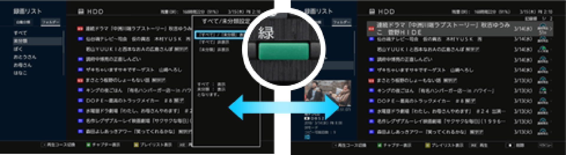 1画面でフォルダー・自動分類リストと番組リストを表示。各リストへの切り替えがスムーズに行えます。