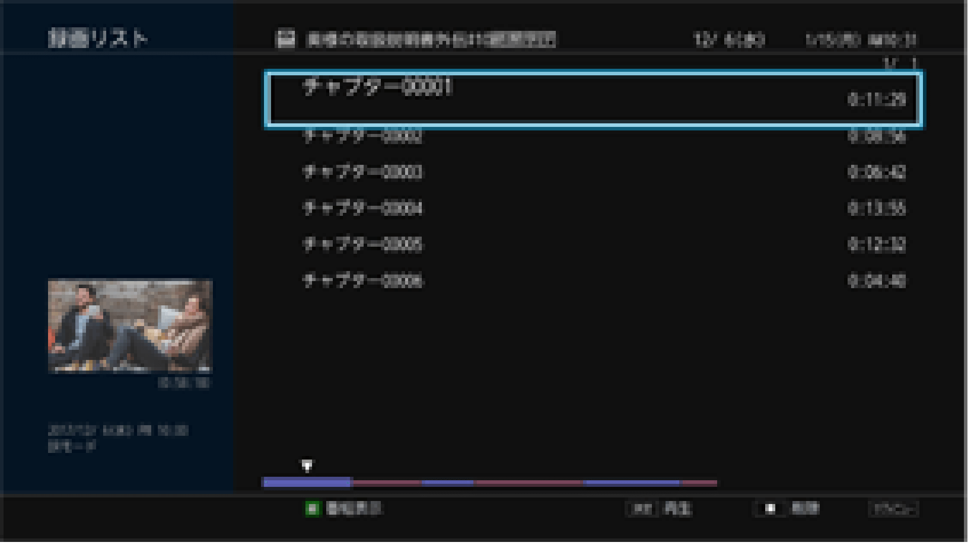 番組選択時にリモコンの「緑」ボタンを押すことで、その番組のチャプターを一覧表示。