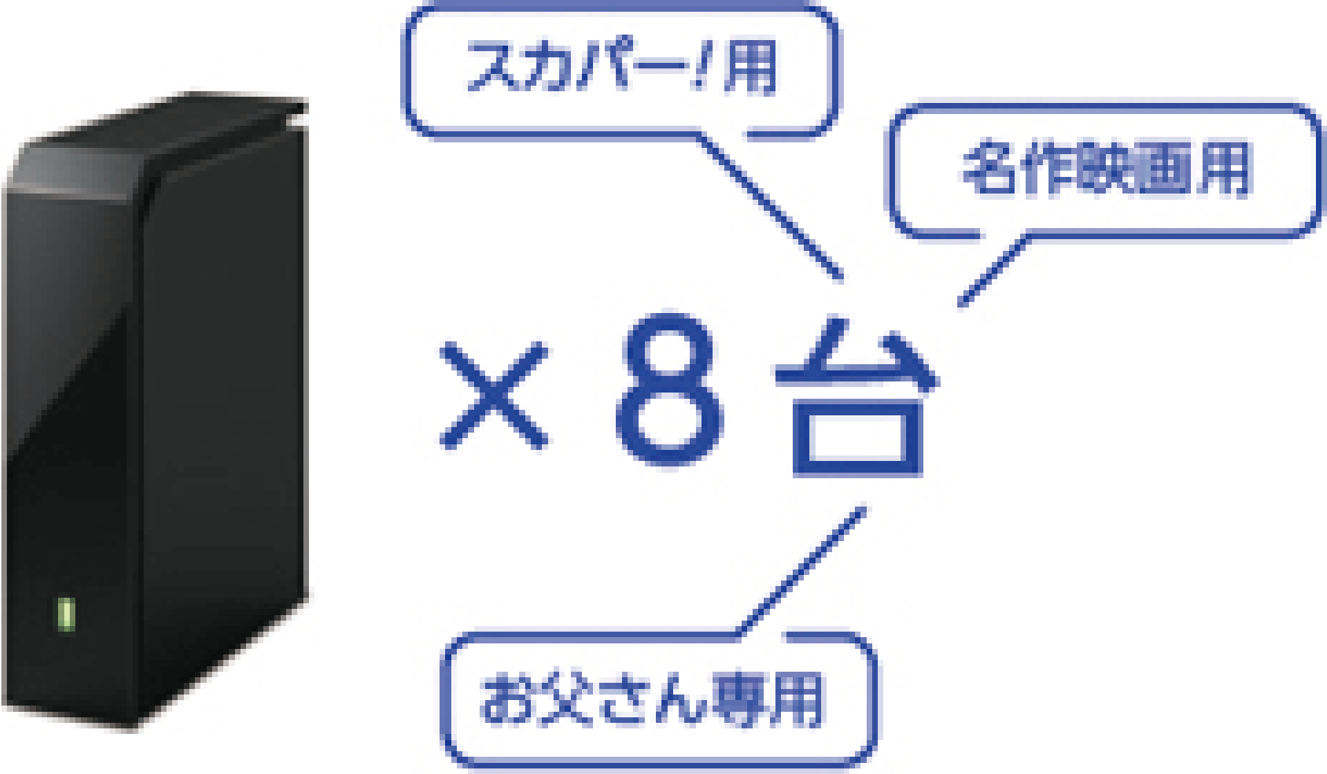 最大8台まで登録可能なので、家族それぞれ自分専用のUSBハードディスクを持ったり、番組のジャンル別に使い分けることが可能です。
