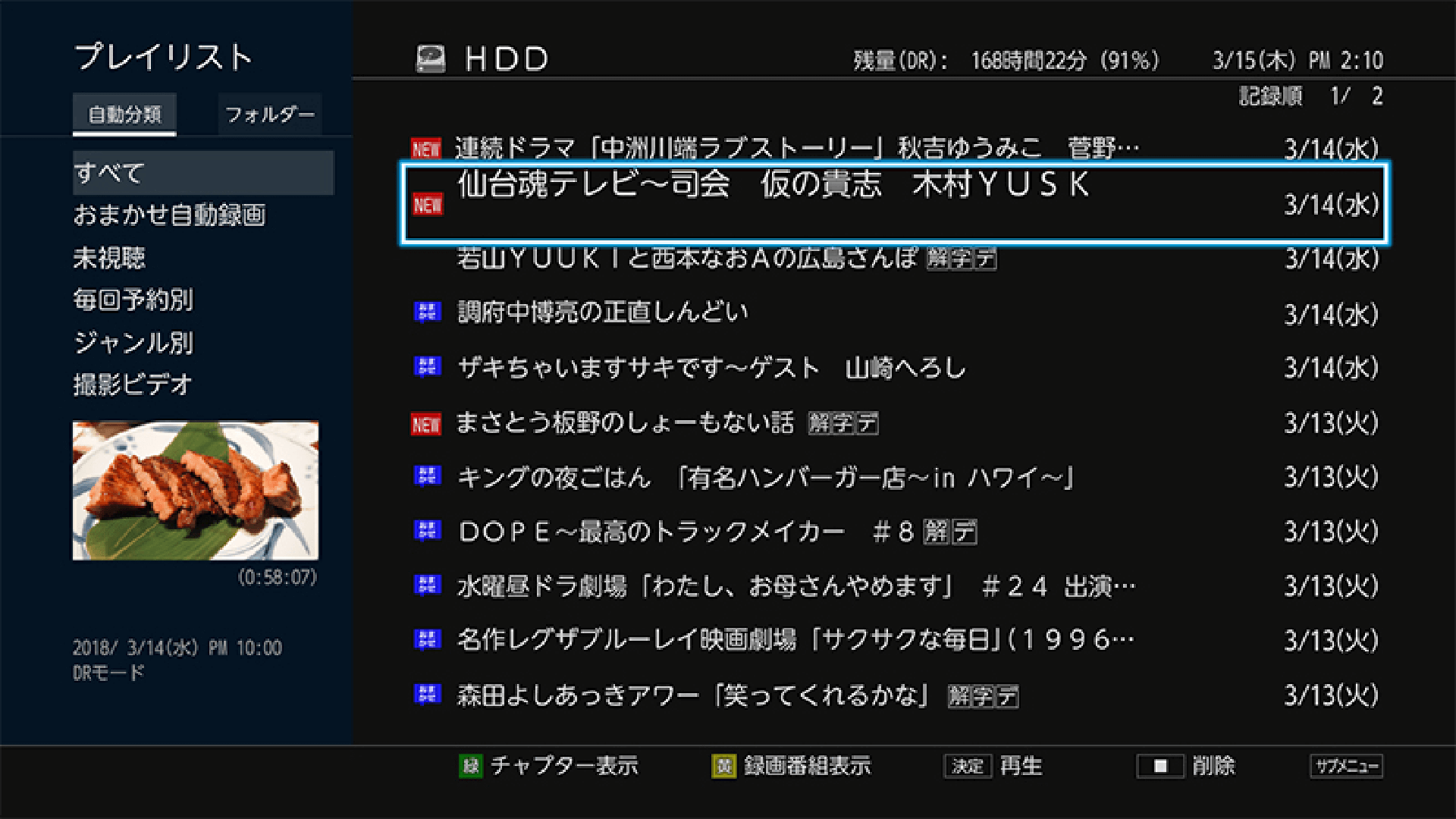 リモコンの「黄」ボタンを押すことで、作成したプレイリストのみを表示。見たい編集番組をチェックする時に便利です。