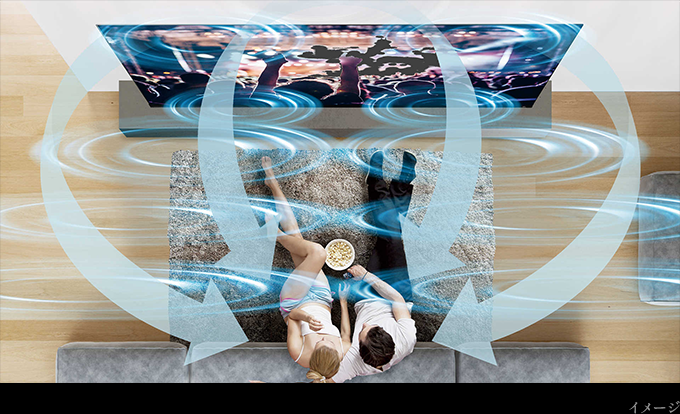 リビングを包み込む迫力ある感動のサウンドを実現。7個のスピーカーを70Wマルチアンプで駆動*1。ボトムスピーカーと重低音バズーカ、トップスピーカーにより迫力の重低音とクリアなサウンドを再現。
