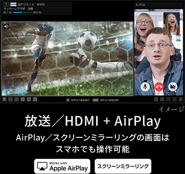 放送/HDMIと放送の組み合わせはもちろん、YouTube、AirPlay、スクリーンミラーリングとの2画面にも対応。放送を見ながらネット動画、SNS動画、ビデオ通話などマルチに楽しめます。