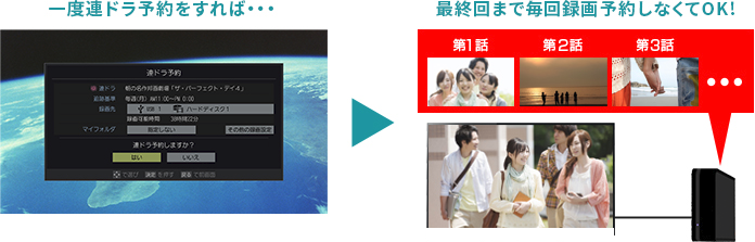 毎週見ている連続ドラマなどを録画する際、次回以降の放送も連続して録画予約するように設定*1できます。放送時間の変更や最終回などの拡大放送にも対応*2し、最後までしっかり録画できます。
