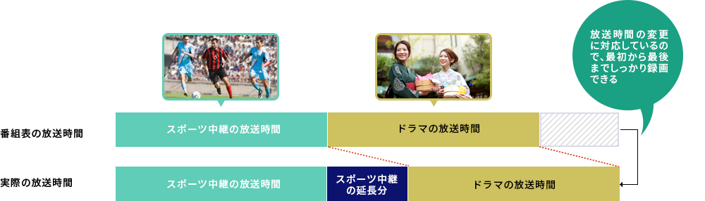 スポーツ中継の延長など、想定していなかった放送時間の変更にも対応*2しているので、録画したドラマが途切れることなく、お楽しみいただけます。